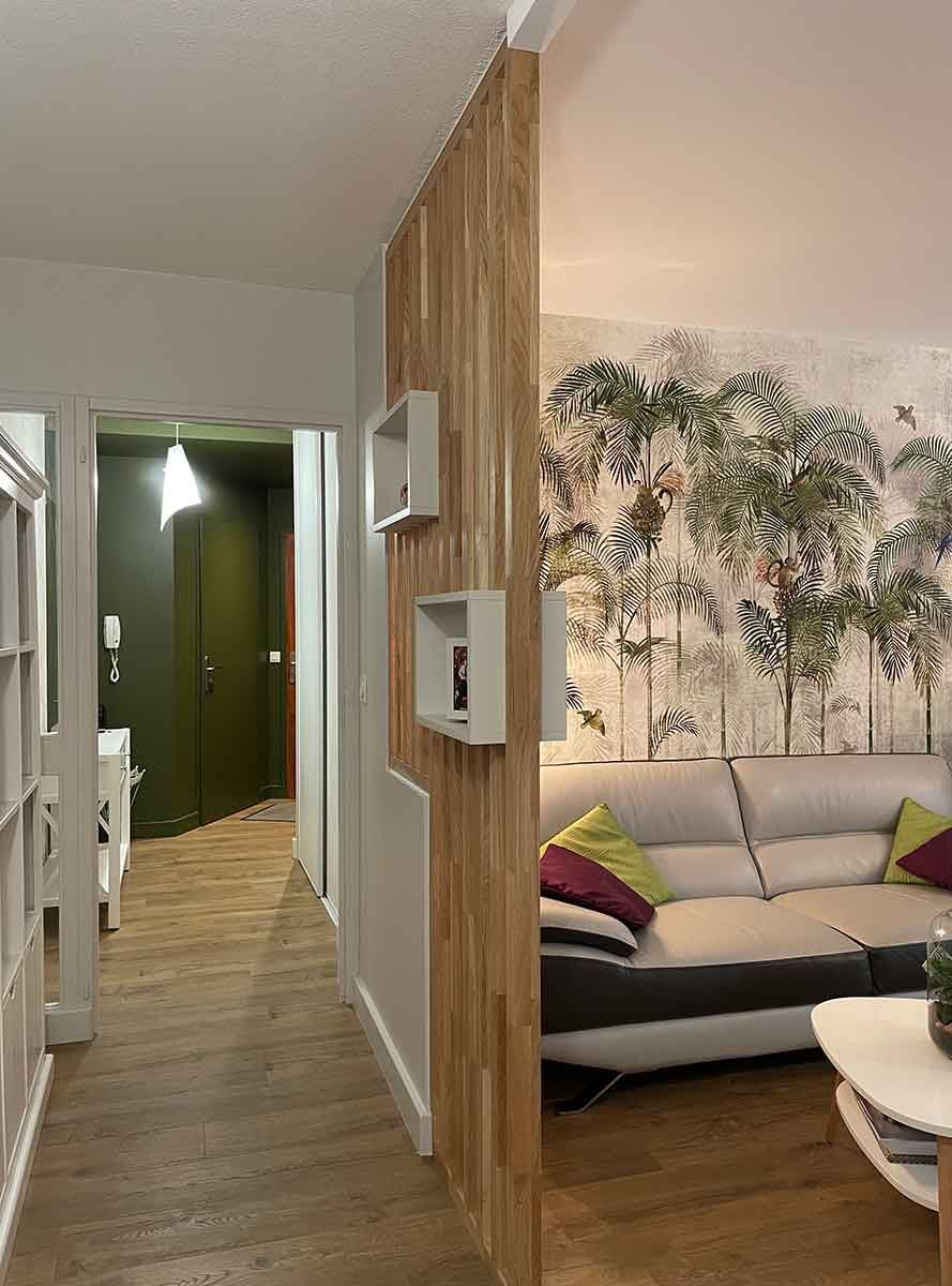 Redynamiser l’intérieur, créer de l’interactivité avec le couloir, apporter de la lumière directe en restructurant l’espace de circulation et la pièce de vie.