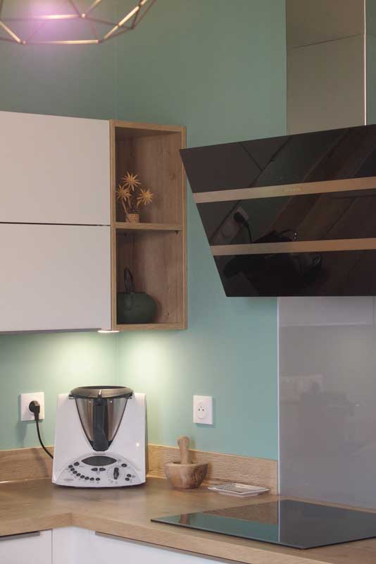 Le carreau hexagonal donne du caractère au sol et aux murs. L’alliance de la tomette et du parquet et sa pose audacieuse vient rythmer l’impression visuelle et délimiter subtilement deux espaces.